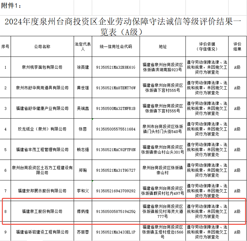 Неодамна, според одредбите на „Известувањето за Бирото за безбедност на луѓето за егзистенција на Комитетот за управување со инвестициската зона Куанжу Тајван за спроведување на оценка за усогласеност и оцена за интегритет на Законот за безбедност на трудот на претпријатијата од 2024 година“ (Quantai Guanminshengwen [2021Quangorydng] по строг преглед, Co.L. (во натамошниот текст „QGM Co., Ltd.“) беше оценет како „2024 Enterprise Labor Security Law Compliance and Integrity Rating A-level Enterprise“, станувајќи едно од 25-те претпријатија во областа што ја добија оваа чест.